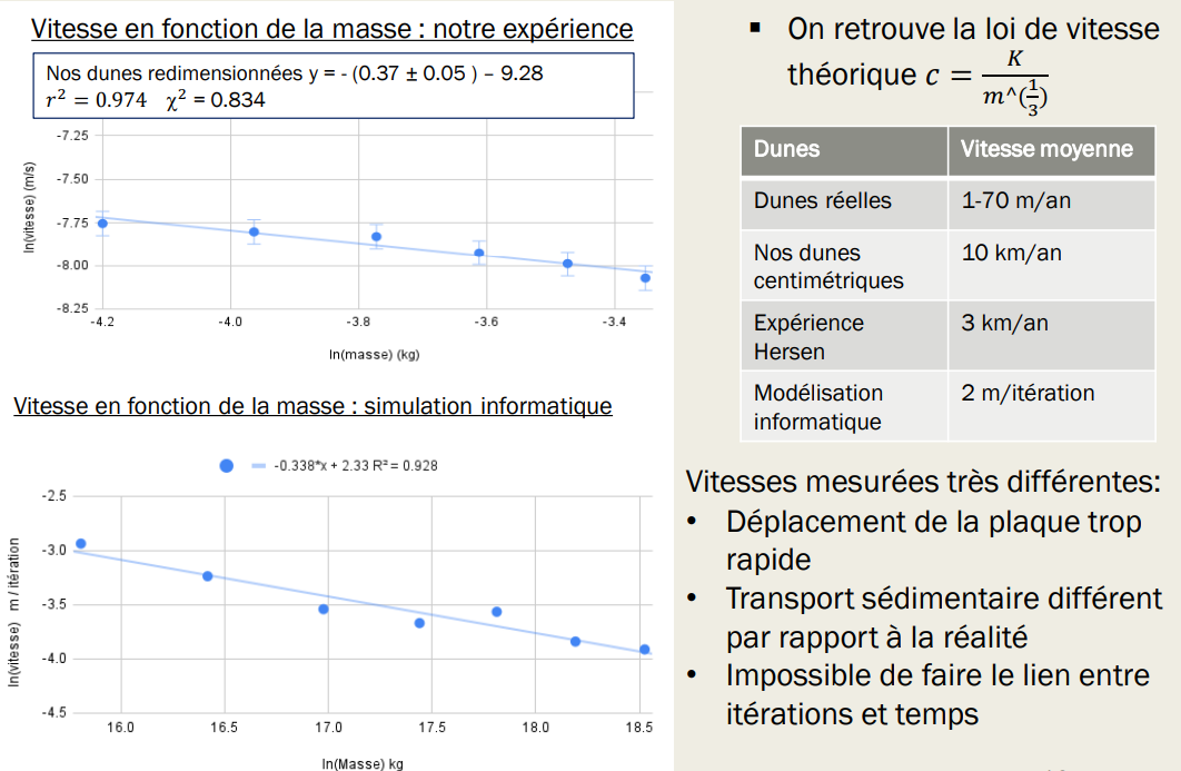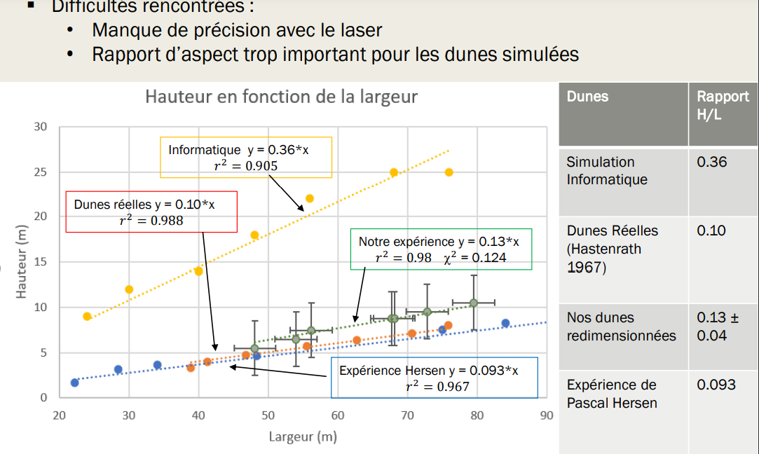 Thus, as found by Pascal Hersen, our dunes are too fast: this may be due to the plate speed being too high. Indeed, with slower movements, Pascal Hersen has already managed to reduce the speed of the dunes, and it is difficult to link the flow speed in our experiment with the plate speed. For the computer simulation, we quickly reach the limits of the model. First, it is difficult to link the number of iterations in the program with real time. Additionally, the arbitrary decision to set a value of 1 = 1 meter for the analogy once again shows the limits of this approach: more coherent comparisons would likely require forming much larger dunes, as seen with the height.