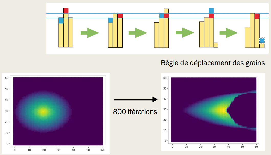 We then developed a simple rule to simulate the movement of sand grains due to the wind flow over the pile: