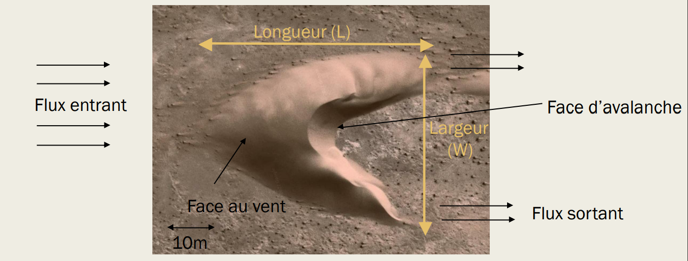 The barkhan dune is a crescent shaped dune typical of deserts like the Sahara, where the wind is unidirectional on average. This gives the dune a very symetrical crescent-like shape. The wind blows up the windward face, and arrives at the top, to the slip face, which is much steeper and is flanked by two horns. The turbulent flow behind the dune creates a recirculation bubble, leading to this characteristic shape. This phenomenon is caused by the detachment of the boundary layer, as the aspect ratio becomes too large, preventing the streamlines from “hugging” the terrain.
