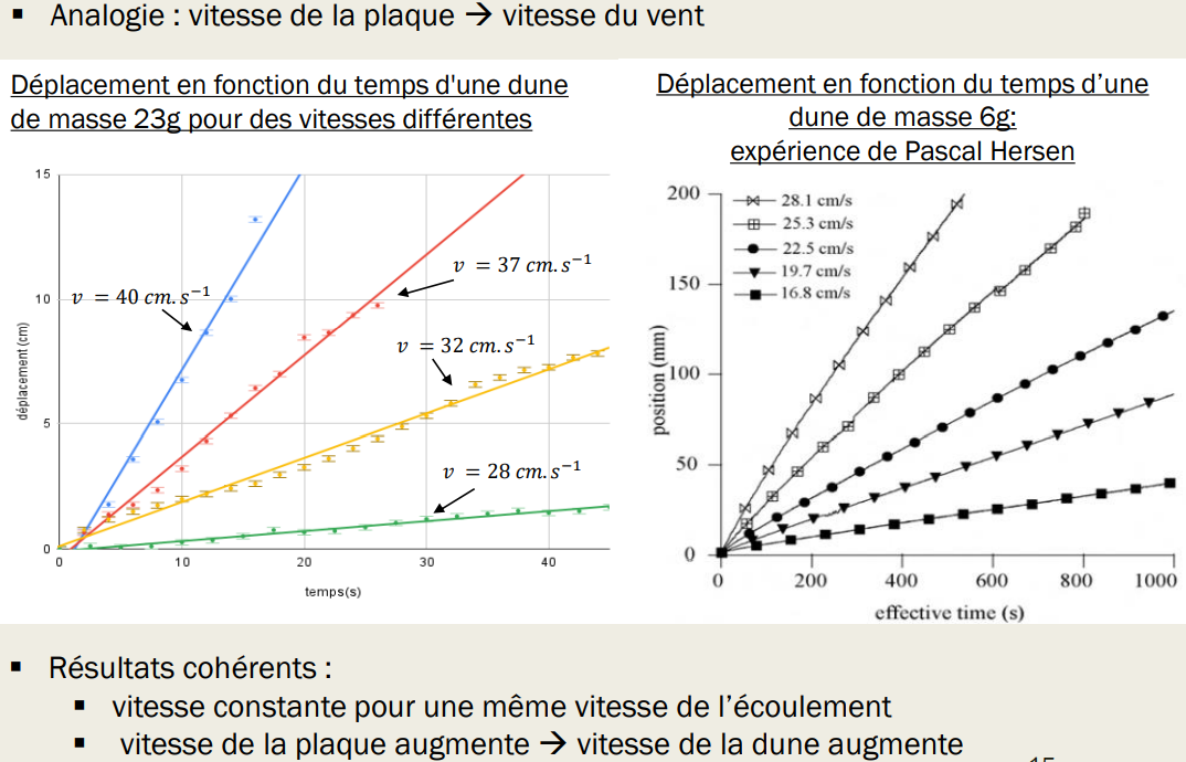 Displacement as a Function of Mass In addition to these qualitative results, we wanted to more precisely verify whether our small-scale dunes and simulated dunes follow the theoretical speed law presented earlier. A mass balance on the dune allows us to relate mass and height. However, measuring height is difficult, so we use the constant ratios to link speed and mass. We approximate by neglecting the losses at the horns because the dune’s displacement speed is high compared to the characteristic times of its morphological evolution due to losses. We study the dune’s displacement on the plate as a function of time to obtain its speed. In both situations, we observe that there is indeed a link between the dune speed and the cube root of its mass. However, we observe large differences in the constant q of proportionality, which depends on the flux at the crest.