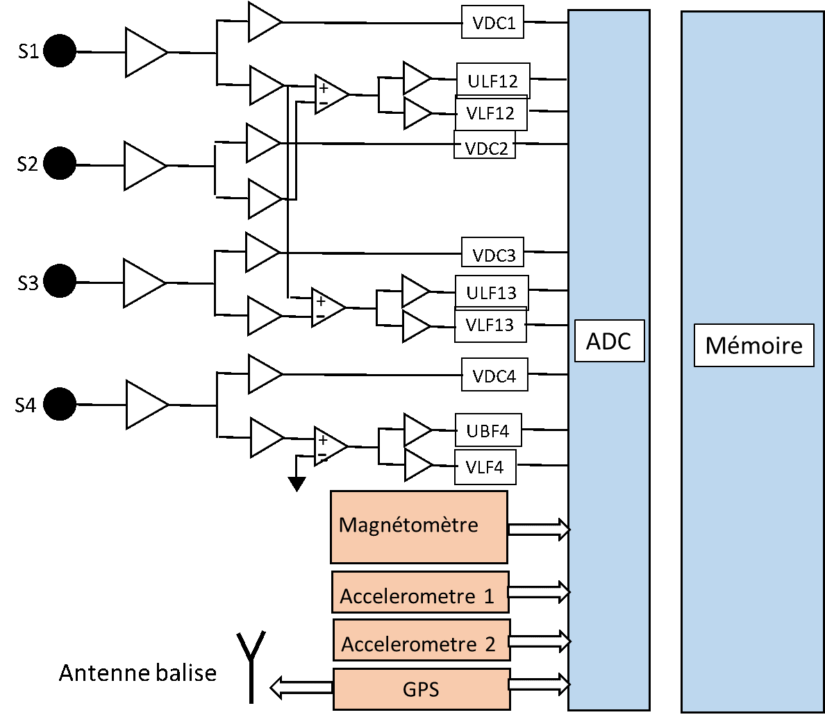 - A magnetometer that allows for the orientation of the nacelle, and thus the components of the AC and DC fields in a reference frame linked to the Earth.