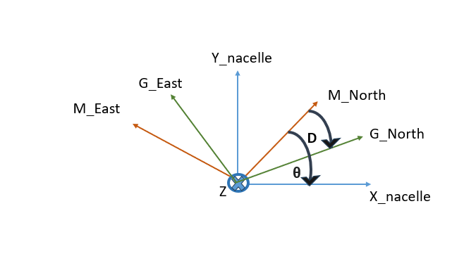 \[\theta = \arctan\left( \frac{B_Y}{B_X} \right)\]After correcting for the declination \(D\), the orientation of the nacelle in the Earth’s coordinate system is obtained using: \(\theta - D \mod 2\pi\)
