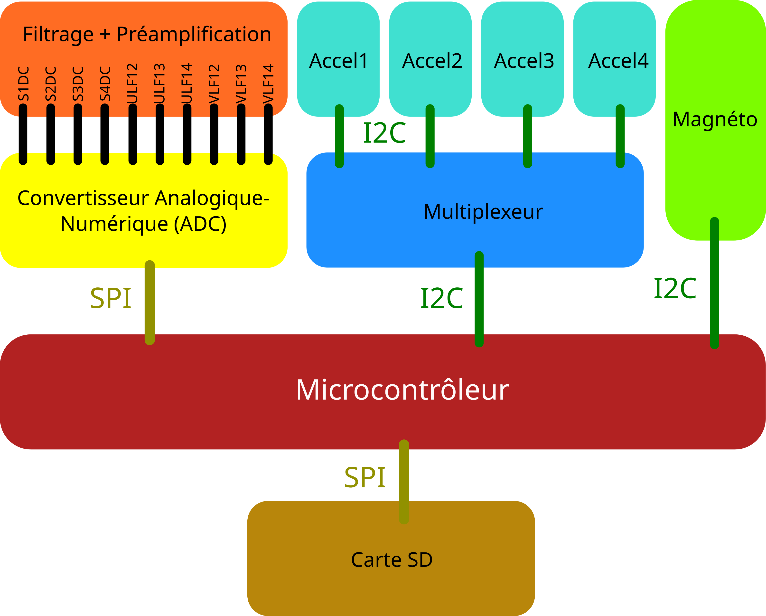 - Three-axis accelerometers added to the arms to measure parasitic vibrations, which could interfere with the measurement of Schumann resonances.